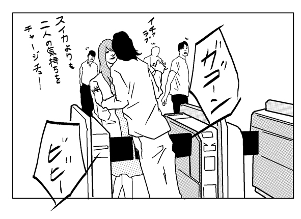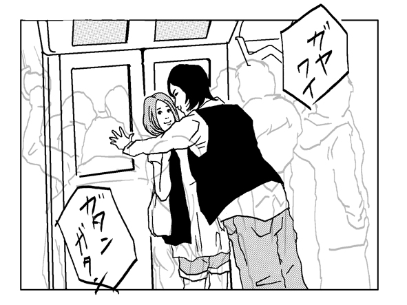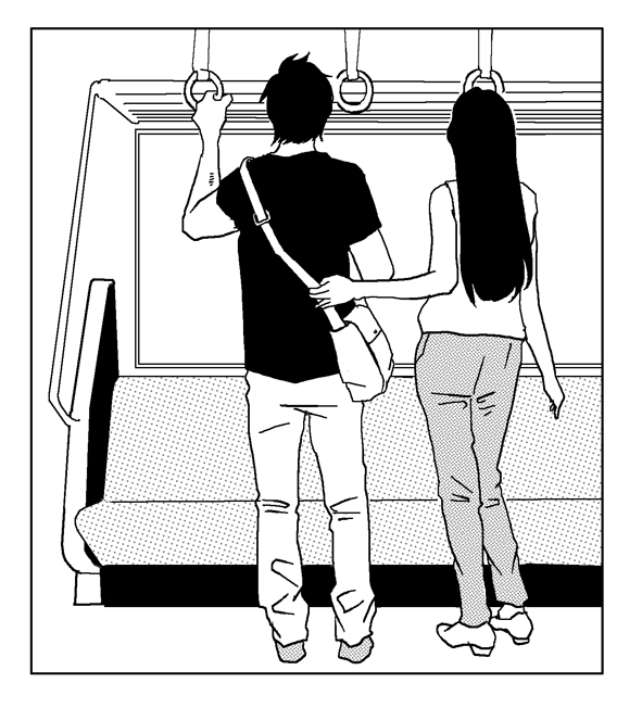 彼氏の方はつり革につかまって、彼女はつり革ではなく彼氏のカバンにつかまってるんですよね。